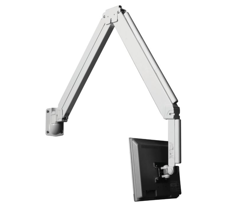 Designed for flat screens up to 28", this full motion wall arm is ideal for mounting behind hospital beds. Supplied with an optional handle for easy screen positioning, it features tilt adjustment and 360° screen rotation in any direction, to display the screen in landscape or portrait style. The space saving design enables the mount to be folded flat to the wall when not in use.